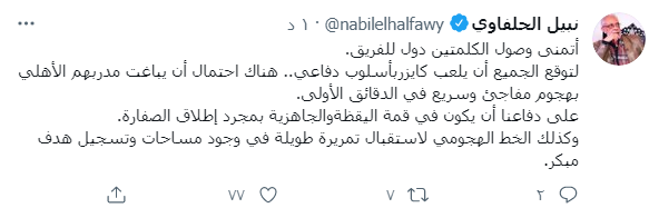 وكتب تغريدة عبر حسابه الشخصي بموقع التدوينات القصيرة "تويتر"، مغردًا: "أتمنى وصول الكلمتين دول للفريق.. لتوقع الجميع أن يلعب كايزر بأسلوب دفاعي.. هناك احتمال أن يباغت مدربهم الأهلي بهجوم مفاجئ وسريع في الدقائق الأولى".