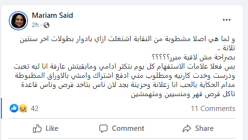 وكتبت مريم على حسابها الشخصي بـ "فيس بوك": “و لما هي أصلا مشطوبة من النقابة اشتغلت إزاي بأدوار بطولات آخر سنتين تلاتة بصراحة مش لاقية مبرر.. بس فعلا علامات الاستفهام كل يوم بتكتر قدامي ومبقتش عارفة أنا ليه تعبت ودرست وخدت كارنيه ومطلوب مني أدفع إشتراك وأمشي بالأوراق المظبوطة مدام الحكاية بالحب أنا زعلانة وحزينة بجد لأن ناس بتاخد فرص وناس قاعدة تاكل قرص قهر ومنسيين ومتهمشين”.
