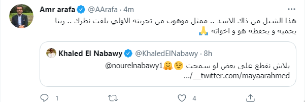 وأعاد “عرفة” نشر تغريدة للفنان خالد النبوي، عبر حسابه الشخصي بموقع التدوينات القصيرة "تويتر": "هذا الشبل من ذاك الأسد.. ممثل موهوب من تجربته الأولى يلفت نظرك، ربنا يحميه ويحفظه هو وأخواته".