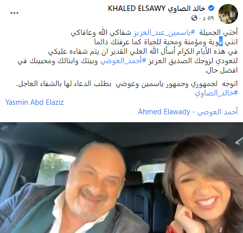 وتابع: "لتعودي لزوجك الصديق العزيز  أحمد العوضي، وبيتك وأبنائك ومحبينك في أفضل حال.. اتوجه لجمهوري وجمهور ياسمين وعوضي، بطلب الدعاء لها بالشفاء العاجل".