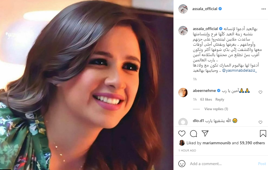 ونشرت الفنانة أصالة صورة للفنانة ياسمين عبد العزيز عبر حسابها بـ "انستجرام"، وعلقت عليها قائلةً: “بهذا العيد أدعوا لإنسانة بتشبه زينة العيد، كلها فرح وابتسامتها ساعدت ملايين لينتصروا على حزنهم وأوجاعهم”.