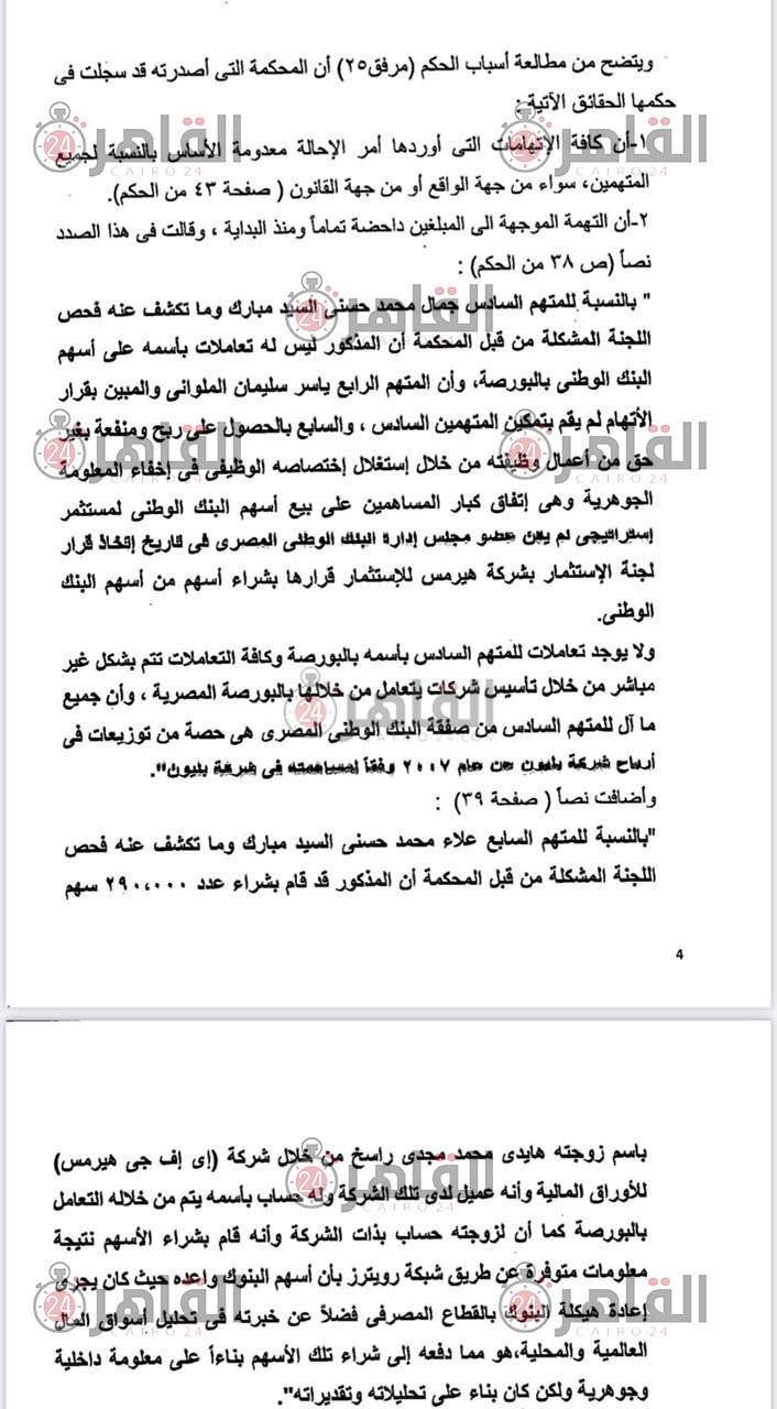 وقالت المحكمة، حسب البلاغ، بالنسبة للمتهم السادس جمال محمد حسني السيد مبارك، وما تكشف عنه فحص اللجنة المشكلة من قبل المحكمة، أن المذكور ليس له تعاملات باسمه على أسهم البنك الوطني بالبورصة، وأن المتهم الرابع ياسر سليمان، والمبين بقرار الاتهام لم يقم بتمكين المتهمين السادس والسابع بالحصول على ربح ومنفعة بغير حق من أعمال وظيفتهن من خلال استغلال اختصاصه الوظيفي، في إخفاء معلومات جوهرية، وهي اتفاق كبار المساهمين على بيع اسهم البنك الوطني لمستثمر استراتيجي، لم يعين عضو مجلس إدارة البنك الوطني المصري، في تاريخ اتخاذ قرار لجنة الاستثمار بشركة هيرمس للاستثمار قرارها بشراء أسهم من أسهم البنك الوطني.