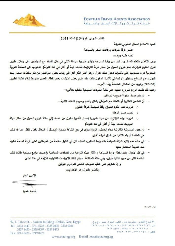"السياحة" تخطر الشركات برحلات طيران "الترانزيت" بأنها برنامج سياحي (مستند)