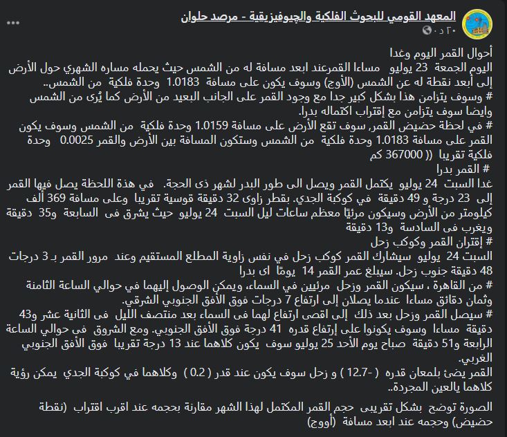 كشف المعهد القومي للبحوث الفلكية، برئاسة الدكتور جاد القاضي، عن حالة القمر اليوم، حيث إن القمر عند أبعد مسافة له من الشمس ويحمله مساره الشهري حول الأرض إلى أبعد نقطة له عن الشمس (الأوج) وسوف يكون على مسافة 1.0183 وحدة فلكية من الشمس.