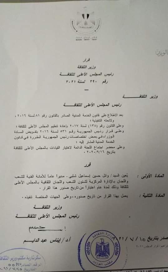 قررت الدكتورة إيناس عبد الدايم وزيرة الثقافة، تعيين وائل حسين إسماعيل مديرًا عامًا للأمانة الفنية للشعب واللجان بالمجلس الأعلى للثقافة، وذلك في إطار خطط الوزارة في تطوير الشعب واللجان التابعة للمجلس الأعلى للثقافة.