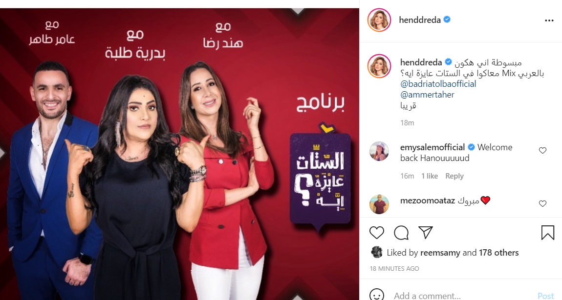 ونشرت هند رضا بوستر البرنامج عبر صفحتها الرسمية على موقع "انستجرام"، وعلقت قائلة: "مبسوطة إني هكون بالعربي معاكوا Mix، في الستات عايزة إيه.. قريبًا".