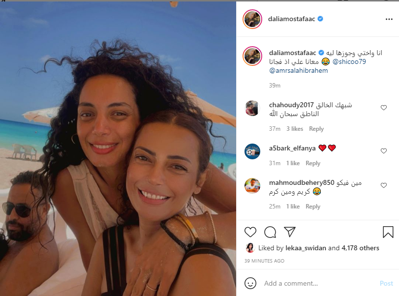 وعلقت داليا مصطفى على الصورة التي نشرتها عبر حسابها الخصا بموقع تبادل الصور والفيديوهات “انستجرام” كاتبة: “أنا وأختي وجوزها ليه معانا علي اذ فجاتا”.