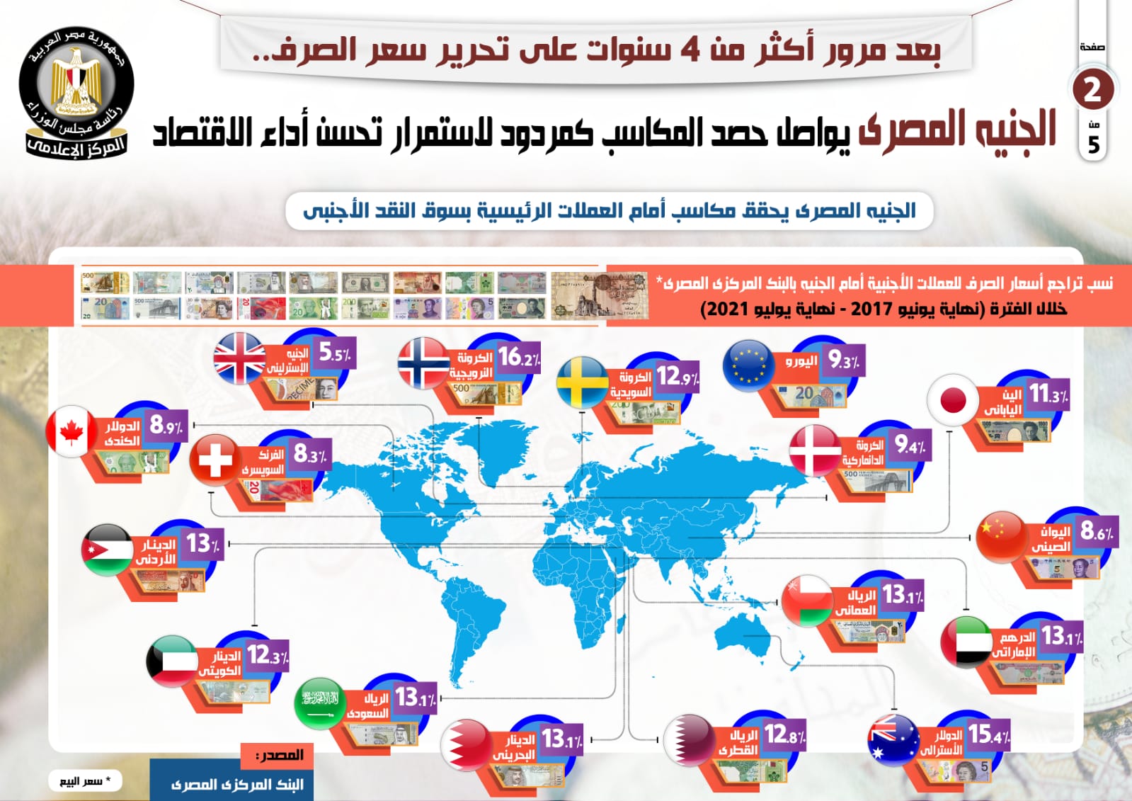 وفي هذا الصدد، نشر المركز الإعلامي لمجلس الوزراء، تقريرًا تضمن إنفوجرافات تسلط الضوء على مواصلة الجنيه المصري تحقيق مكاسب كمردود لاستمرار تحسن أداء الاقتصاد، وذلك بعد مرور أكثر من 4 سنوات على تحرير سعر الصرف.
