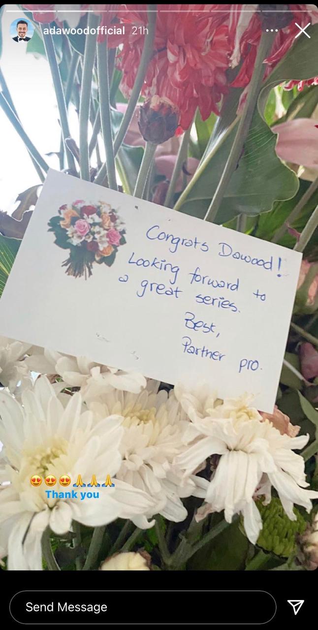 ونشر داود عبر استوري حسابه الخاص بموقع تبادل الصور والفيديوهات انستجرام صورة لبوكيه ورد مُرسل له من قِبل شركة إنتاج المسلسل لتهنئ أحمد داوود على المسلسل وتتمنى إنجاز مسلسل قوي يعجب الجمهور.
