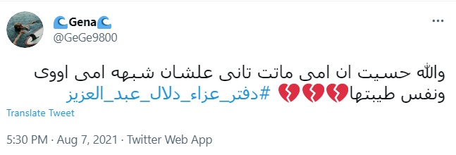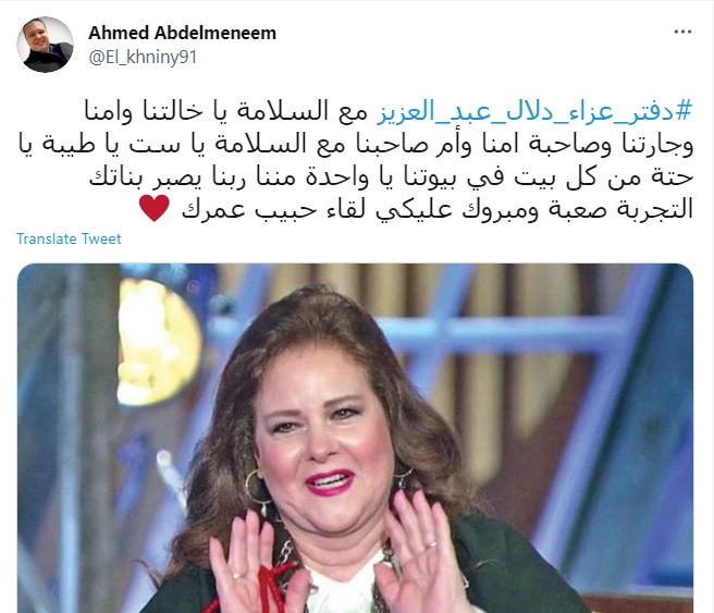 ونشر أحمد عبد الغني: "دفتر عزاء دلال عبد العزيز، مع السلامة يا خالتنا وأمنا وجارتنا وصاحبة أمنا وأم صاحبنا، مع السلامة يا ست يا طيبة يا حتة من كل بيت في بيوتنا، يا واحدة مننا ربنا يصبر بناتك التجربة صعبة ومبروك عليكي لقاء حبيب عمرك".