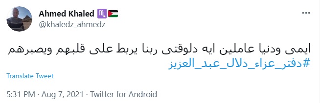 وقال أحمد خالد: "إيمى ودنيا عاملين آيه دلوقتي.. ربنا يربط على قلبهم ويصبرهم.. دفتر عزاء دلال عبد العزيز".