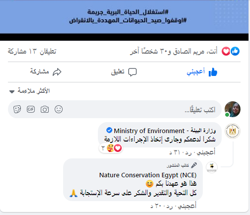 من جانبها تفاعلت وزارة البيئة مع بيان الجمعيتين بشأن الصيد الجائر للحيوانات، حيث علّقت الوزارة على منشور الجمعية المصرية لحماية الطبيعة، وقالت إنه جارٍ اتخاذ الإجراءات اللازمة.
