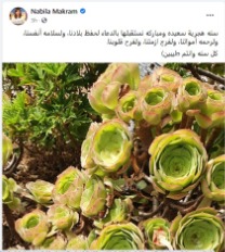 وقالت السفيرة نبيلة مكرم، عبر صفحتها الشخصية بموقع التواصل الاجتماعي “فيس بوك”، “سنة هجرية سعيدة ومباركة نستقبلها بالدعاء لحفظ بلادنا، ولسلامه أنفسنا، ولرحمه أمواتنا، ولفرج أزمتنا، ولفرح قلوبنا.. كل سنة وأنتم طيبين".