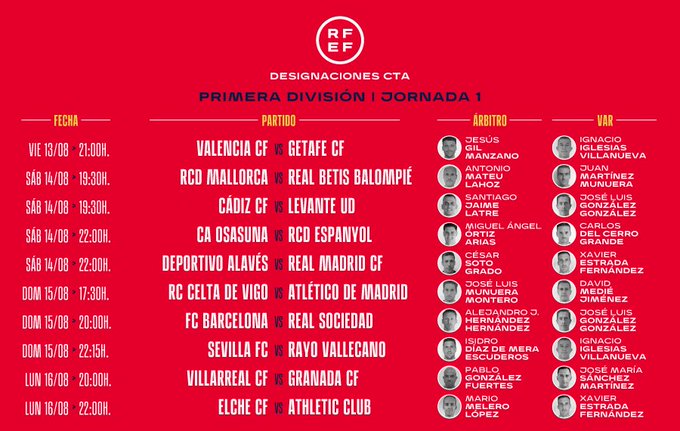 أعلنت رابطة الدوري الإسباني لكرة القدم، حكام مباريات الجولة الأولى من مسابقة الدوري الإسباني الممتاز الليجا، والتي ستنطلق غدًا بمواجهة ضمن منافسات الجولة الافتتاحية.