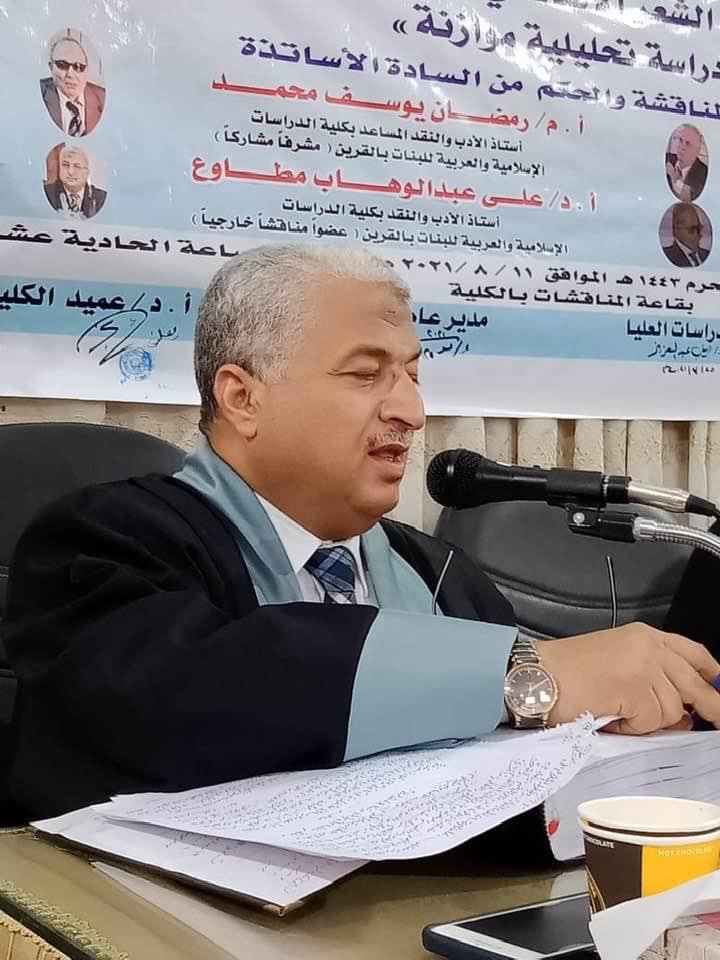 يشار إلى أن حلقة الإشراف العلمي على الرسالة، ضمت الدكتور مصطفى البسطويسي عطا أستاذ الأدب والنقد ببنات المنصورة فرع جامعة الأزهر، والدكتور رمضان يوسف محمد أستاذ الأدب والنقد ببنات القرين فرع جامعة الأزهر.