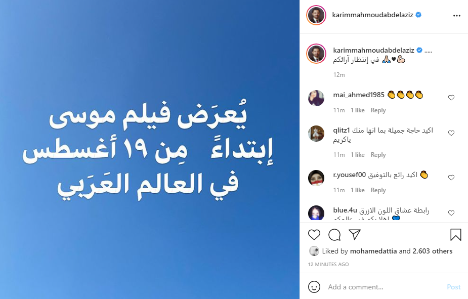 ونشر كريم محمود عبد العزيز صورة عبر حسابه الرسمي بموقع الصور والفيديوهات «انستجرام» صورة يروج فيها للفيلم، حيث كتب: «يعرض فيلم موسى ابتداءً من 19 أغسطس الجاري في العالم العربي»، وعلق عليها قائلًا: «في انتظار آرائكم».