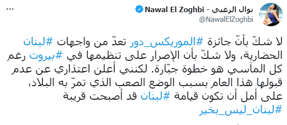 وكتبت نوار الزغبي في تغريدة عبر حسابها الرسمي بموقع التغريدات القصيرة تويتر تدوينة قالت فيها: لا شكّ بأنّ جائزة الموريكس دور، تعد من واجهات لبنان الحضارية، ولا شك بأن الإصرار على تنظيمها في بيروت رغم كل المآسي هو خطوة جبارة.