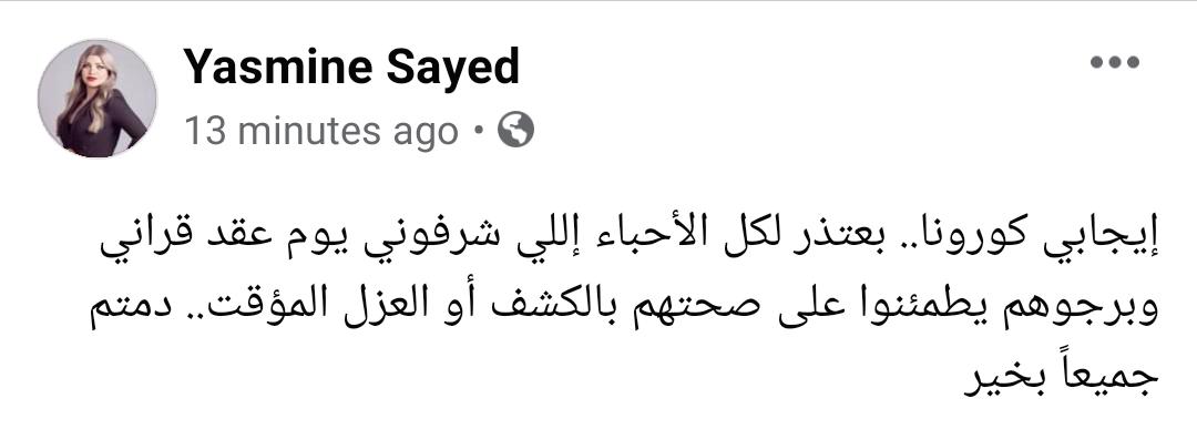 وطلبت ياسمين من حاضري حفل عقد قرانها التأكد من سلامة حالتهم الصحية أو العزل المؤقت لحين التأكد، وكتبت عبر حسابها الشخصي على موقع التواصل الاجتماعي فيسبوك: إيجابي كورونا.. بعتذر لكل الأحباء اللي شرفوني يوم عقد قراني وبرجوهم يطمنوا على صحتهم بالكشف أو العزل المؤقت.. دمتم جميعًا بخير.