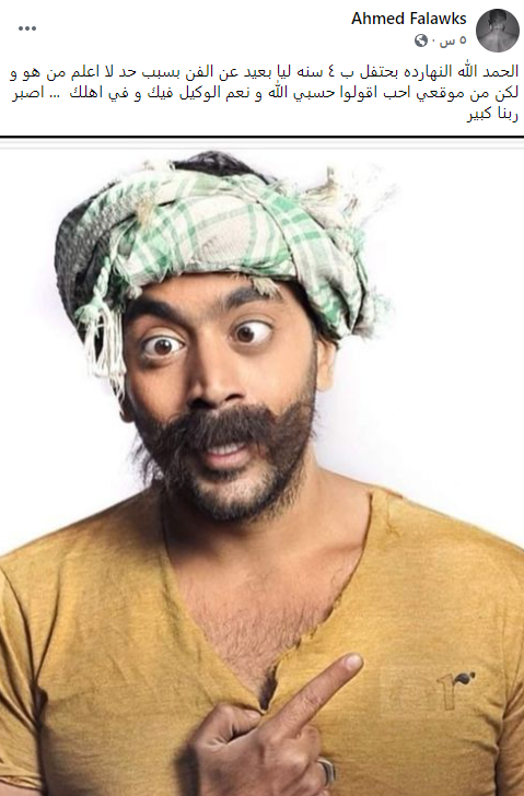 ونشر أحمد فلوكس صورته على حسابه الرسمي بـ فيسبوك، وعلق عليها قائلًا: الحمد الله النهاردة بحتفل برابع سنة ليا بعيدا عن الفن، بسبب حد لا أعلم من هو ولكن من موقعي أحب أقول له حسبي الله ونعم الوكيل فيك وفي أهلك.. أصبر ربنا كبير.