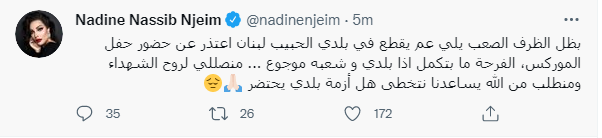 وعلقت الفنانة اللبنانية نادين نسيب نجيم على حادث انفجار عكار، وكتبت عبر حسابها الشخصي على تويتر الآتي: بظل الظرف الصعب يلي عم يقطع في بلدي الحبيب لبنان أعتذر عن حضور حفل الموركس، الفرحة ما بتكمل إذا بلدي وشعبه موجوع، منصللي لروح الشهداء ومنطلب من الله يساعدنا نتخطى هل أزمة بلدي يحتضر.