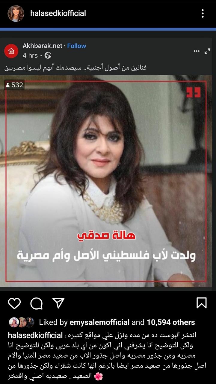 وأوضحت هالة صدقي حقيقة الأمر، من خلال نشرها صورة لها عبر حسابها الشخصي على موقع تبادل الصور والفيديوهات القصيرة انستجرام، وعلقت عليها قائلةً: انتشر البوست ده من مدة ونزل على مواقع كتيرة ولكن للتوضيح أنا يشرفني إني أكون من أي بلد عربي ولكن لتوضيح أنا مصرية ومن جذور مصرية وًاصل جذور الأب من صعيد مصر المنيا، والأم أصل جذورها من صعيد مصر أيضًا بالرغم أنها كانت شقراء ولكن جذورها من الصعيد.. صعيدية أصلي وأفتخر.