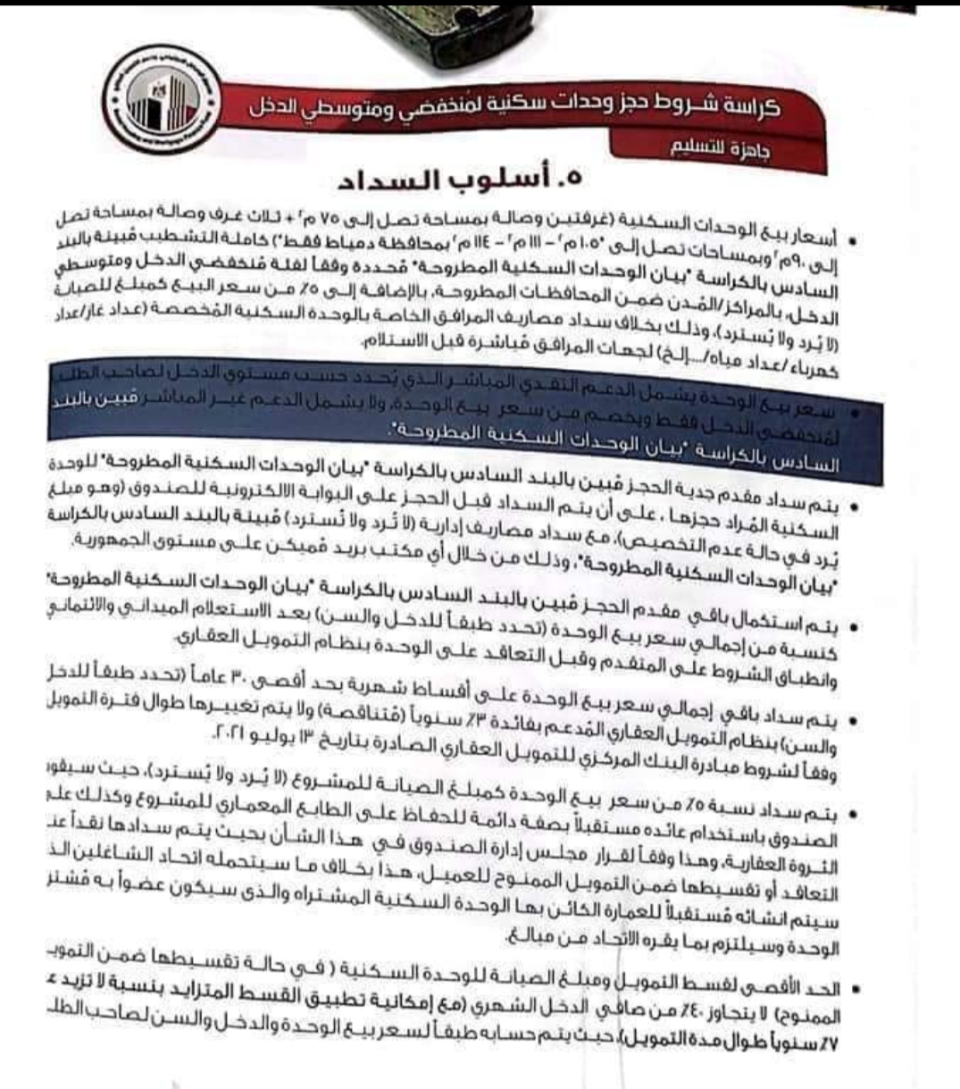 ثالثا: يتم سداد باقي سعر الشقة على أقساط شهرية لمدة 30 عامًا كحد أقصى.