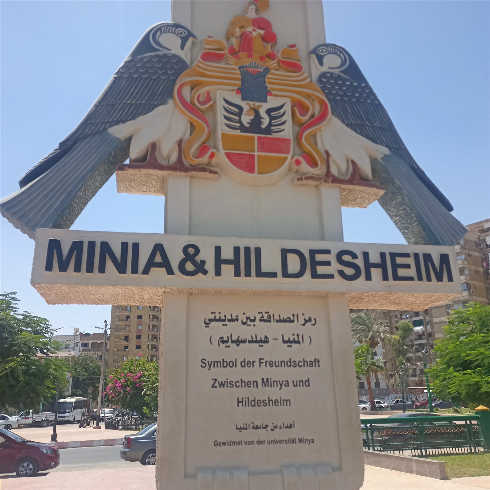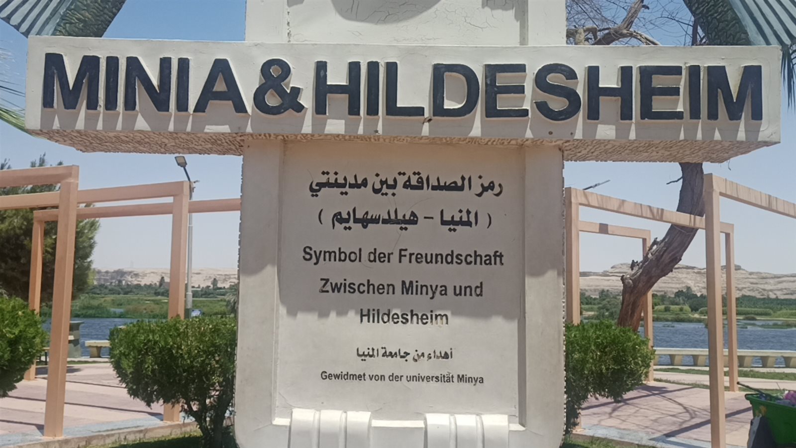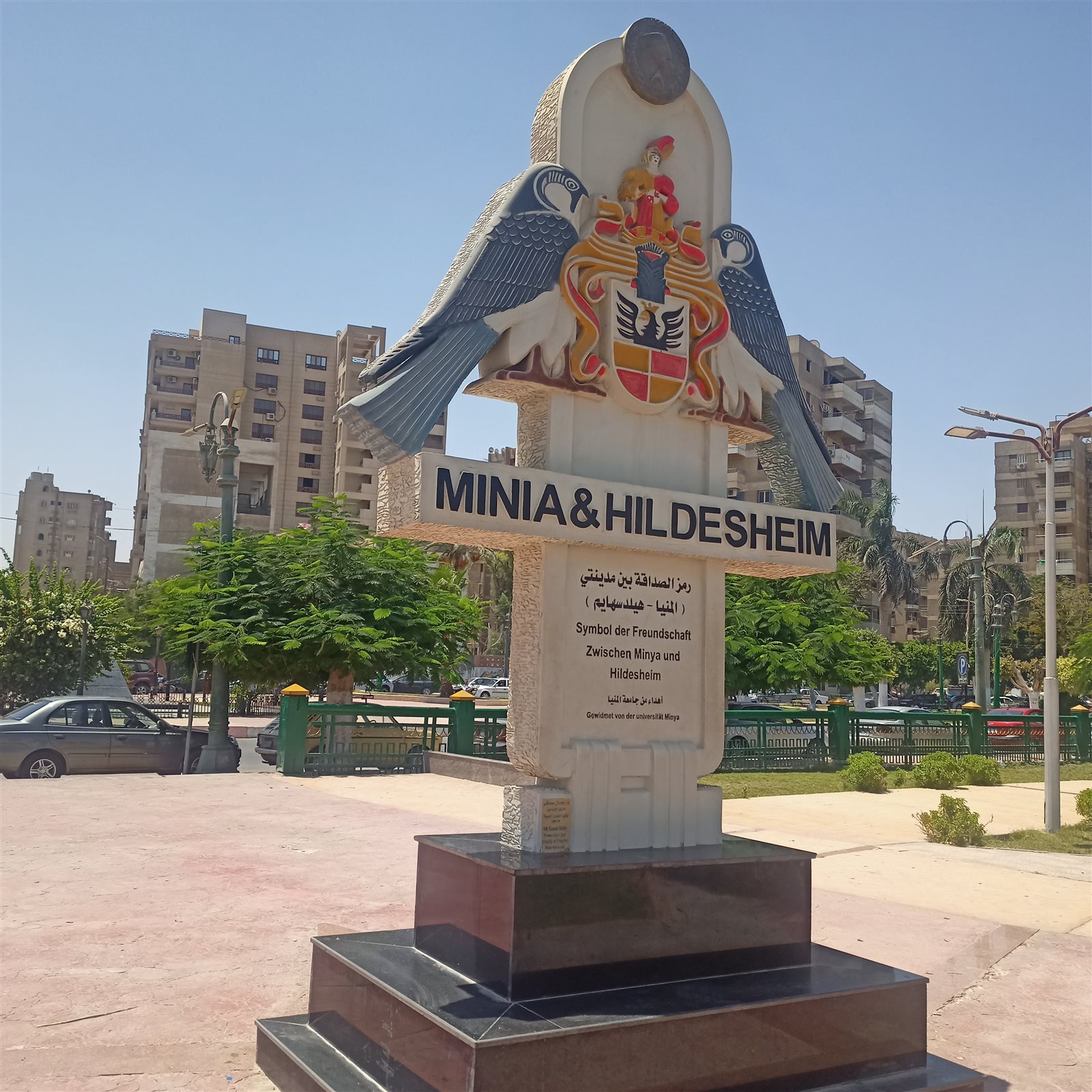 الحكاية بدأت يوم 23 من نوفمبر عام 2019، عندما افتتح اللواء قاسم حسين، محافظ المنيا آنذاك، والدكتور آنجو ماير، عمدة مدينة هيلدسهايم الألمانية، رمز الصداقة بين مدينتي المنيا وهيلدسهايم الألمانية، والمُقام بالمرحلة الثانية على كورنيش مدينة المنيا أمام تمثال طه حسين من جهة الكورنيش.