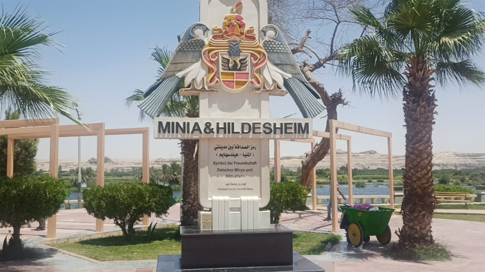 بخرطوشة فرعونية تحمل الرمز المصري والألماني، يتزين كورنيش النيل في محافظة المنيا، برمز صداقة يحكي قصة التوأمة والتآخي بين مدينتي المنيا وهيلدسهايم الألمانية، والتي بدأت عام 1979.