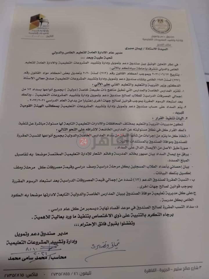 وحصل القاهرة 24، على مستند إعلان الصندوق حيث يتم السداد على حساب صندوق دعم وتمويل وإدارة وتشييد المشروعات التعليمية بمكاتب الهيئة القومية للبريد، على أن تكون مديريات التربية والتعليم بمختلف المحافظات والإدارات التعليمية التابعة لها مسئولية مباشرة عن تنفيذ ذلك القرار كل في نطاق مسئوليته عن المدارس الخاضعة لإشرافه.