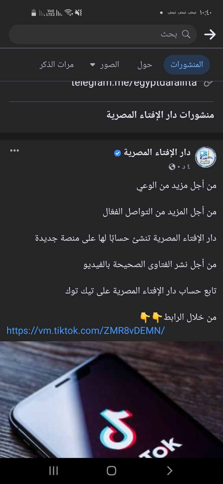 ونشرت الإفتاء رابط حسابها على تيك توك، داعية جمهورها على فيسبوك إلى متابعة الحساب الجديد على تيك توك؛ للوقوف دائمًا على الأحكام الشرعية السليمة.