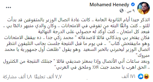 وروى الفنان محمد هنيدي ذكرياته مع الثانوية العامة، وذلك عبر حسابه الشخصي بموقع التواصل الاجتماعي فيس بوك، قائلًا: اتذكر جيدًا أيام الثانوية العامة.. كانت عادة اتصال الوزير بالمتفوقين قد بدأت للتو، وكنت واثقًا البتة من تفوقي في الامتحانات.