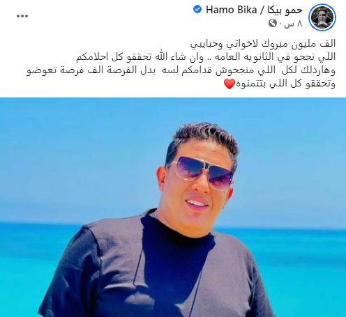 وكتب مغني المهرجانات حمو بيكا منشورًا، عبر حسابه الشخصي بموقع التواصل الاجتماعي فيس بوك، قائلًا: «ألف مليون مبروك لاخواتي وحبايبي، اللي نجحوا في الثانوية العامة، وإن شاء الله تحققوا كل أحلامكم، وهاردلك لكل اللي منجحوش، قدامكم لسه بدل الفرصة ألف فرصة، تعوضوا وتحققوا كل اللي بتتمنوه».