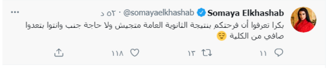 كما علقت الفنانة سمية الخشاب على تدني درجات نتيجة الثانوية العامة، وذلك عبر حسابها الشخصي على موقع التغريدات القصيرة تويتر، قائلة: بكرا تعرفوا أن فرحتكم بنتيجة الثانوية العامة متجيش ولا حاجة جنب وانتوا بتعدوا صافي من الكلية.