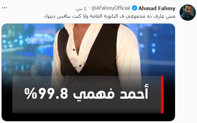 وشارك الفنان أحمد فهمي جمهوره بنتيجته في الثانوية العامة، ساخرًا من الدرجات العالية التي حصل عليها في الثانوية العامة، حيث حصل على مجموع 99.8%، وكتب فهمي تدوينة عبر حسابه الشخصي بموقع تويتر، قائلًا: مش عارف ده مجموعي في الثانوية العامة، ولا كنت بنافس ديتول.