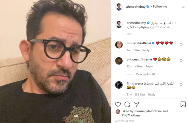 أما الفنان أحمد حلمي فنشر صورة له عبر حسابه الشخصي بموقع تبادل الصور والفيدوهات الشهير انتسجرام، وعلق عليها ساخرًا: لما اسمع حد بيقول خلصت الثانوية وهترتاح في الكلية.