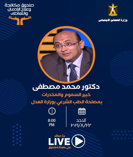 يستضيف صندوق مكافحة وعلاج الإدمان والتعاطي، برئاسة نيفين القباج وزيرة التضامن الاجتماعي، ورئيس مجلس إدارة الصندوق الدكتور محمد مصطفى، خبير السموم بمصلحة الطب الشرعي، غدًا الأحد، من خلال بث مباشر في تمام الساعة الثامنة مساءً على الصفحة الرسمية للصندوق فيسبوك.