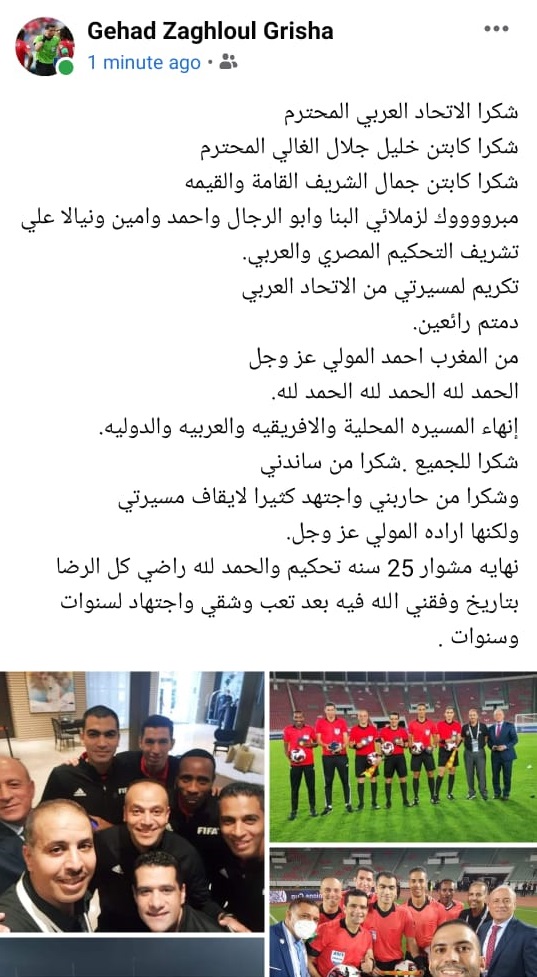 كما أضاف جهاد جريشة قائلا: «مبروك لزملائي البنا وأبو الرجال وأحمد وأمين ونيالا على تشريف التحكيم المصري والعربي، تكريم لمسيرتي من الاتحاد العربي دمتم رائعين».