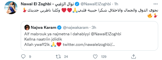 أعادت نوال الزغبي نشر التغريدة، لترد على نجوى كرم قائلة: «نجوى الذوق والجمال والأخلاق.. وكلنا ناطرين جديدك».