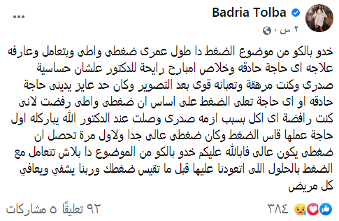 نشرت بدرية طلبة، عبر حسابها الشخصي بموقع التواصل الاجتماعي فيسبوك، منشورًا جاء فيه: خدوا بالكم من موضوع الضغط ده، طول عمري ضغطي واطي، وبتعامل وعارفة علاجه أي حاجة حادقة وخلاص.