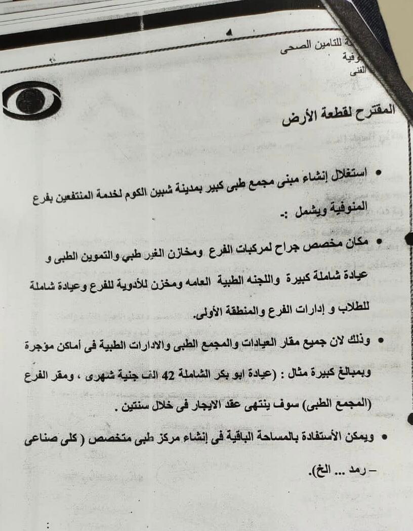 أوضح أن المقترح إنشائه على تلك الأرض، يشمل استغلال الأرض لإنشاء مجمع طبي كبير تابع لهيئة التأمين الصحي، لخدمة أهالي المحافظة، إنشاء عيادات شاملة ولجنة الطبية وجراج كبير ومخزن لأدوية الفرع وإدارات الفرع، وكذلك يشمل المنطقة الأولى لتأمين الصحي.