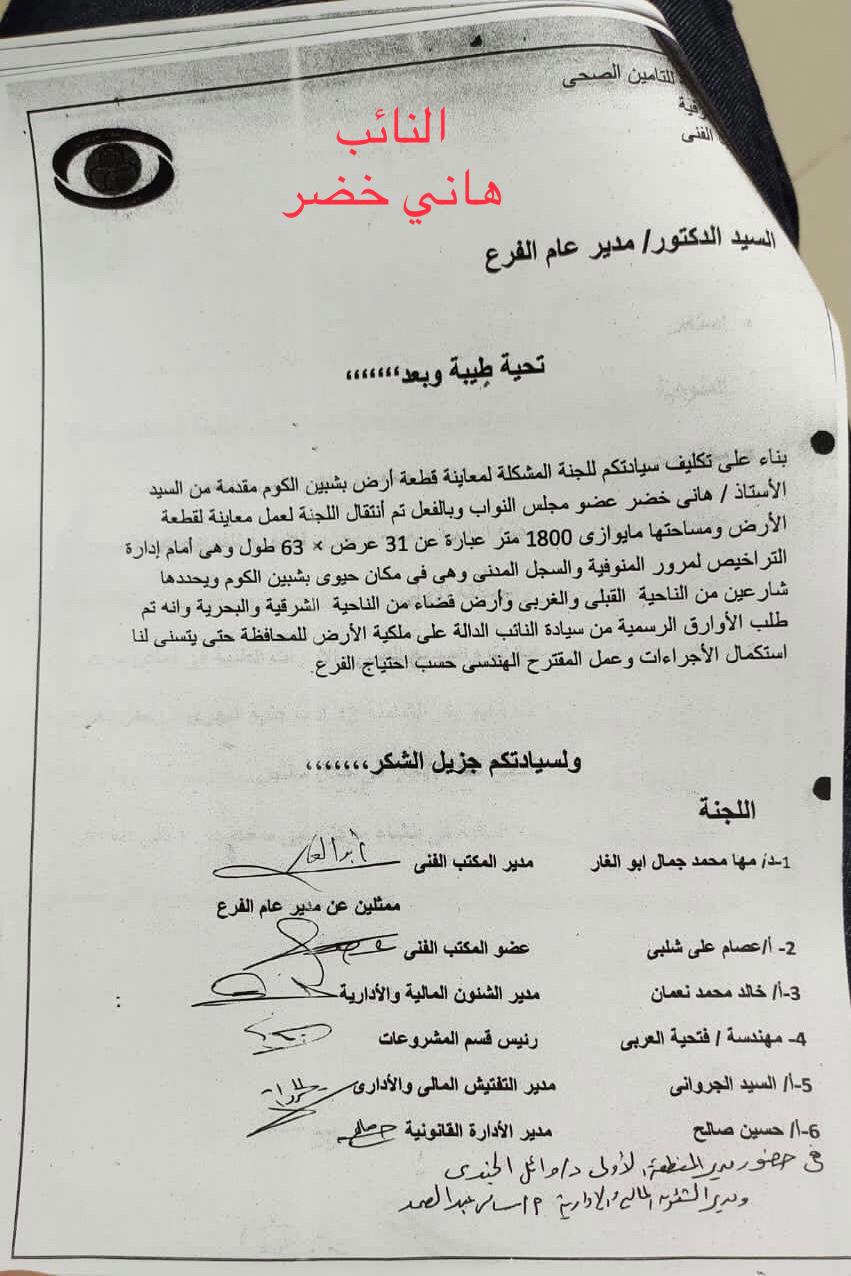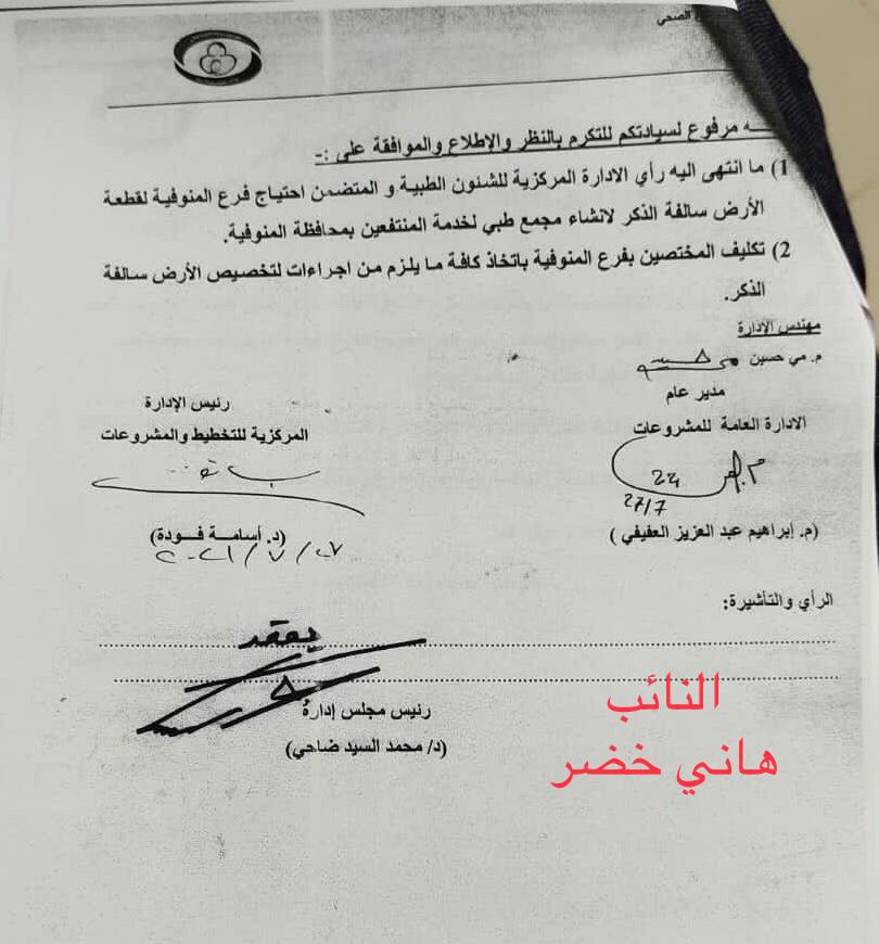 أكد خضر، الموافقة المبدئية من إبراهيم أبو الليمون، محافظ المنوفية على تخصيص الأرض لصالح الهيئة العامة للتأمين الصحي.