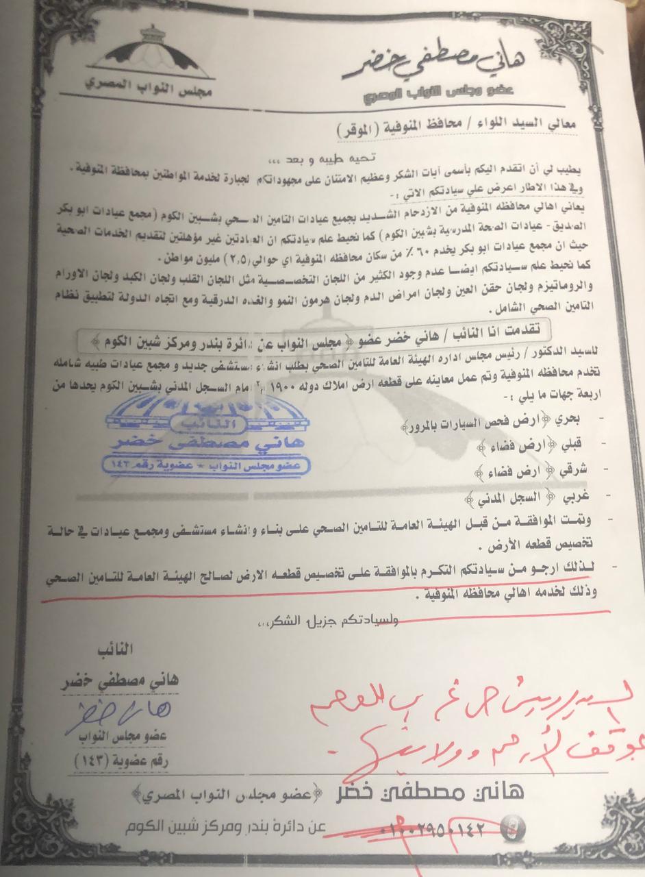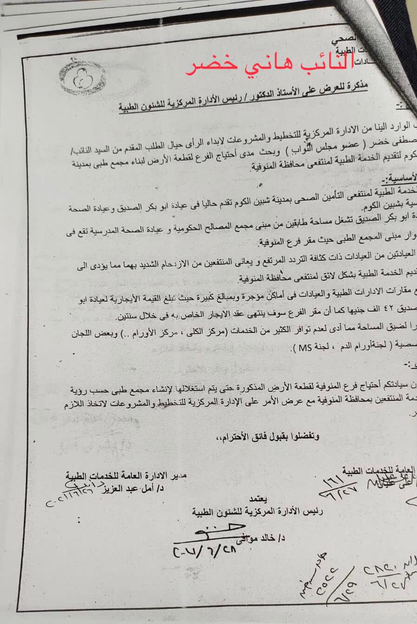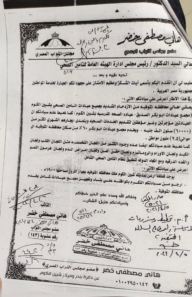 أعلن النائب هاني خضر، عضو مجلس النواب عن دائرة شبين الكوم، وعضو لجنة الدفاع والأمن القومي، نجاحه في الحصول على موافقة الهيئة العامة للتأمين الصحي، بإنشاء وبناء مستشفى ومجمع عيادات، لخدمة أهالي محافظة المنوفية ومركز وبندر شبين الكوم على أرض مملوكة للدولة مساحتها 1900 متر بمدينة شبين الكوم بجوار السجل المدني.