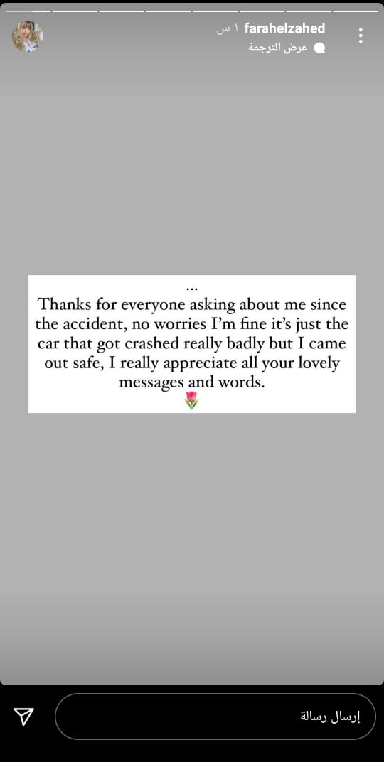ونشرت فرح الزاهد ستوري، عبر حسابها الشخصي بموقع تبادل الصور والفيديوهات انستجرام، قائلة: شكرًا لكل من سأل عني بعد هذا الحادث، لا تقلقوا أنا بخير، عربيتي اتصدمت بقوة جدًا، لكن الحمد لله، مررت منها بسلام، وأنا مُقدرة جدًا رسائلكم وكلامكم الجميل.. شكرًا لكم.