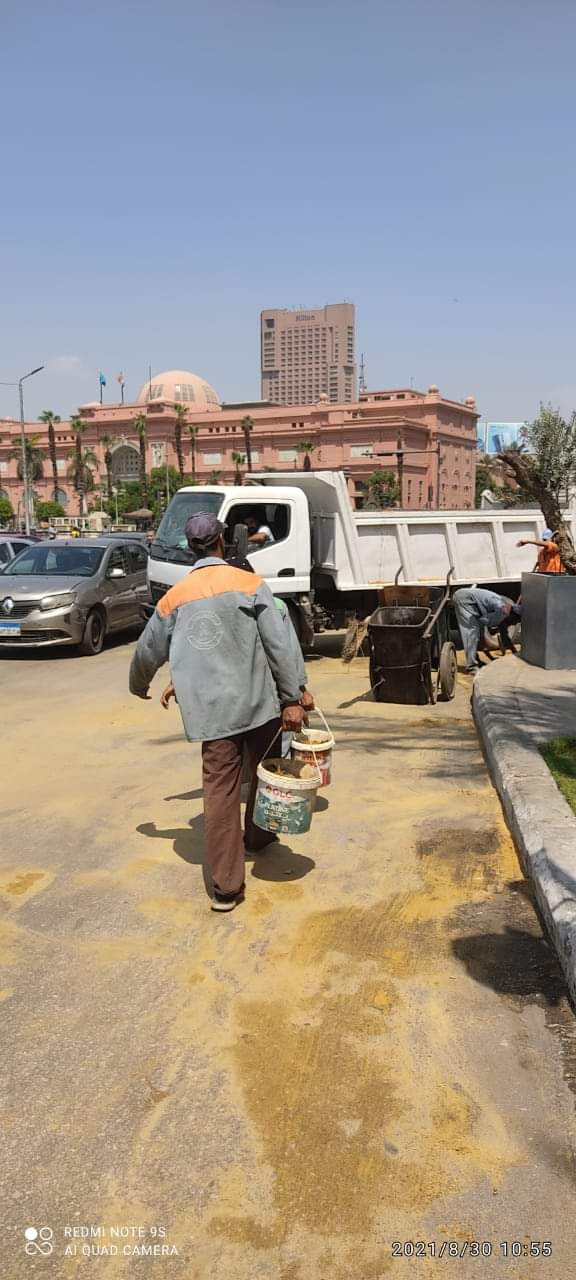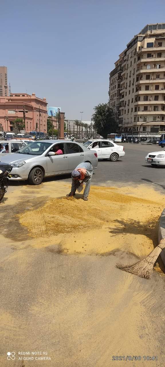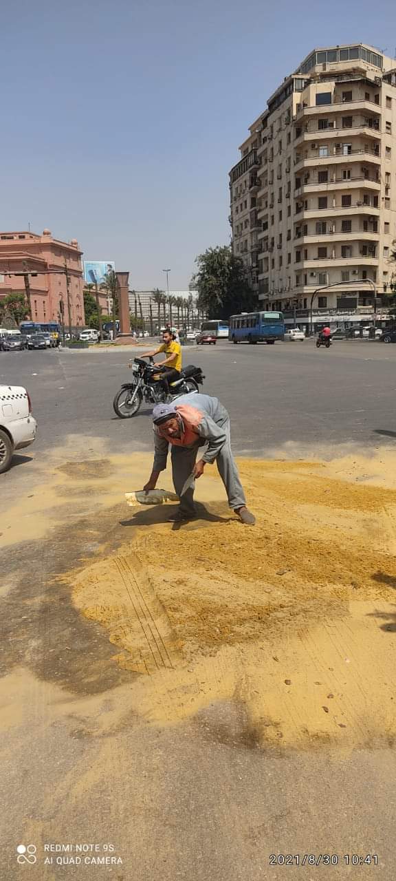 انقلبت سيارة محملة بالزيت، في ميدان التحرير، ما دفع المسئولين بحي غرب القاهرة، للتحرك ومعالجة الأمر، بوضع رمال على الزيت لامتصاص آثار الزيت الناتج عن انقلاب السيارة.