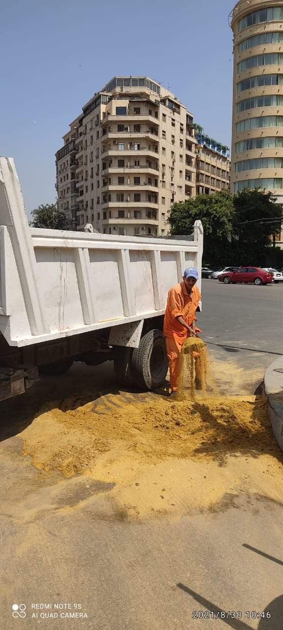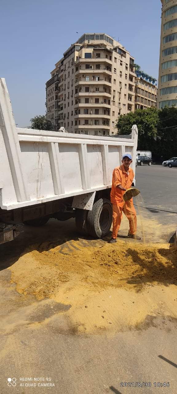 دفع الحي بمجموعة من رجال النظافة لكنس ونظافة وتجميع الرمال التي تم نثرها على بقعة الزيت الناتجة عن انقلاب سيارة، وتيسير حركة سير السيارات.
