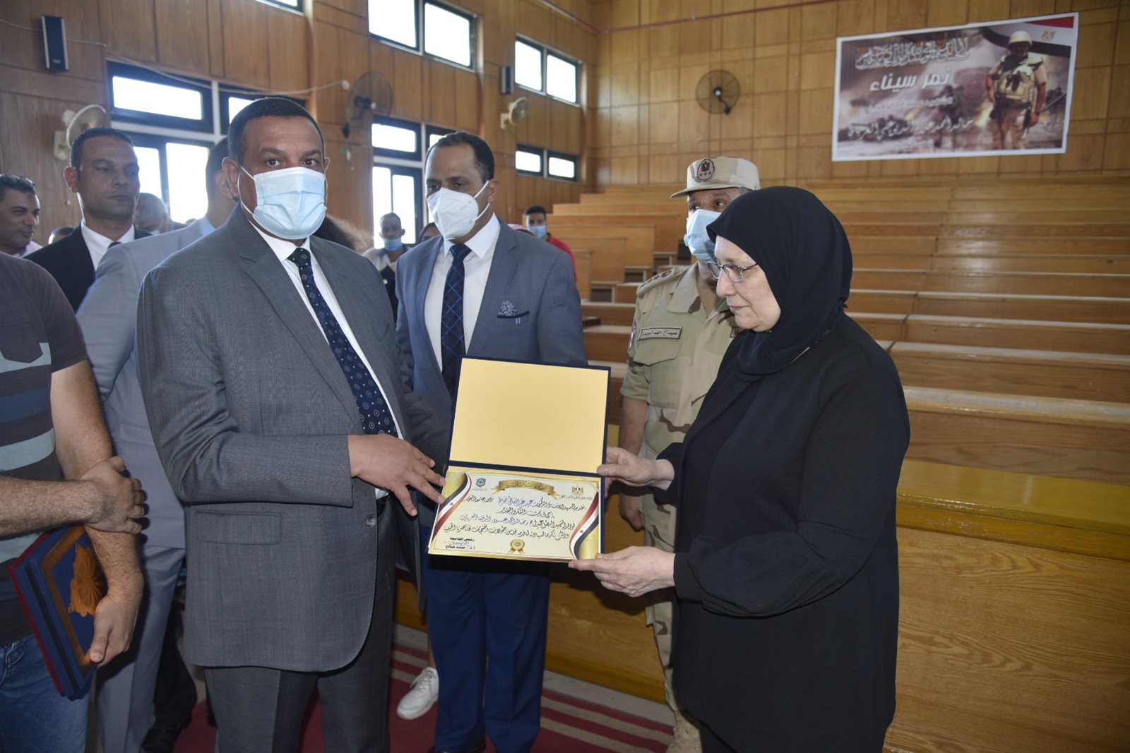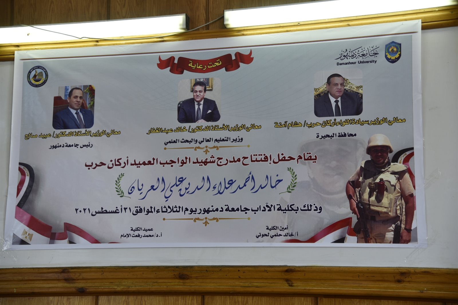 افتتح اللواء هشام آمنة، محافظ البحيرة، والدكتور عبيد صالح، رئيس جامعة دمنهور، اليوم الثلاثاء، مدرج الشهيد عميد أركان حرب خالد أحمد علاء الدين العريان، ابن مدينة دمنهور بمحافظة البحيرة، حيث تم إطلاق اسمه على مدرج بكلية الآداب جامعة دمنهور، وذلك تخليدًا لذكراه، وتقديرًا لتضحياته في سبيل عزة وكرامة الوطن، وذلك بحضور والدة الشهيد وشقيقه وزوجته وأبنائه والعميد أحمد السويدي، المستشار العسكري للمحافظة، وعمداء الكليات وأعضاء هيئة التدريس.