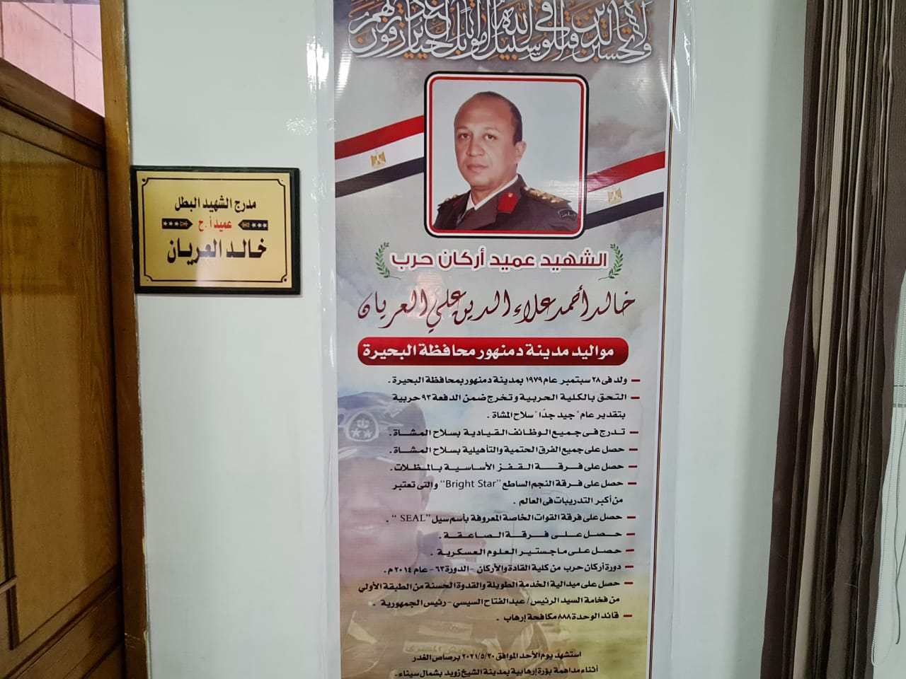 الجدير بالذكر أن الشهيد البطل عميد أركان حرب خالد العريان قائد الوحدة 888 مكافحة إرهابSEAL من مواليد مدينة دمنهور ولد في 28 سبتمبر عام 1979 وأُستشهد يوم 11 يناير الماضي بشمال سيناء جراء انفجار عبوة ناسفة استهدفت المدرعة التي كان يستقلها وهو يدافع عن تراب بلده مصر الغالية.
