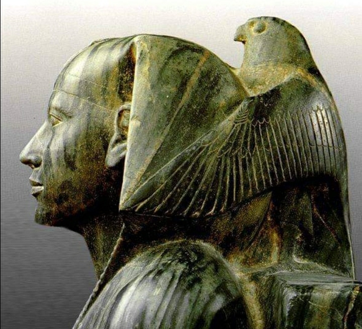 ويقف الإله حورس بهيئة الصقر على ظهر العرش، خلف رأس الملك، ويفرد جناحيه حول الملك كرمز للحماية.