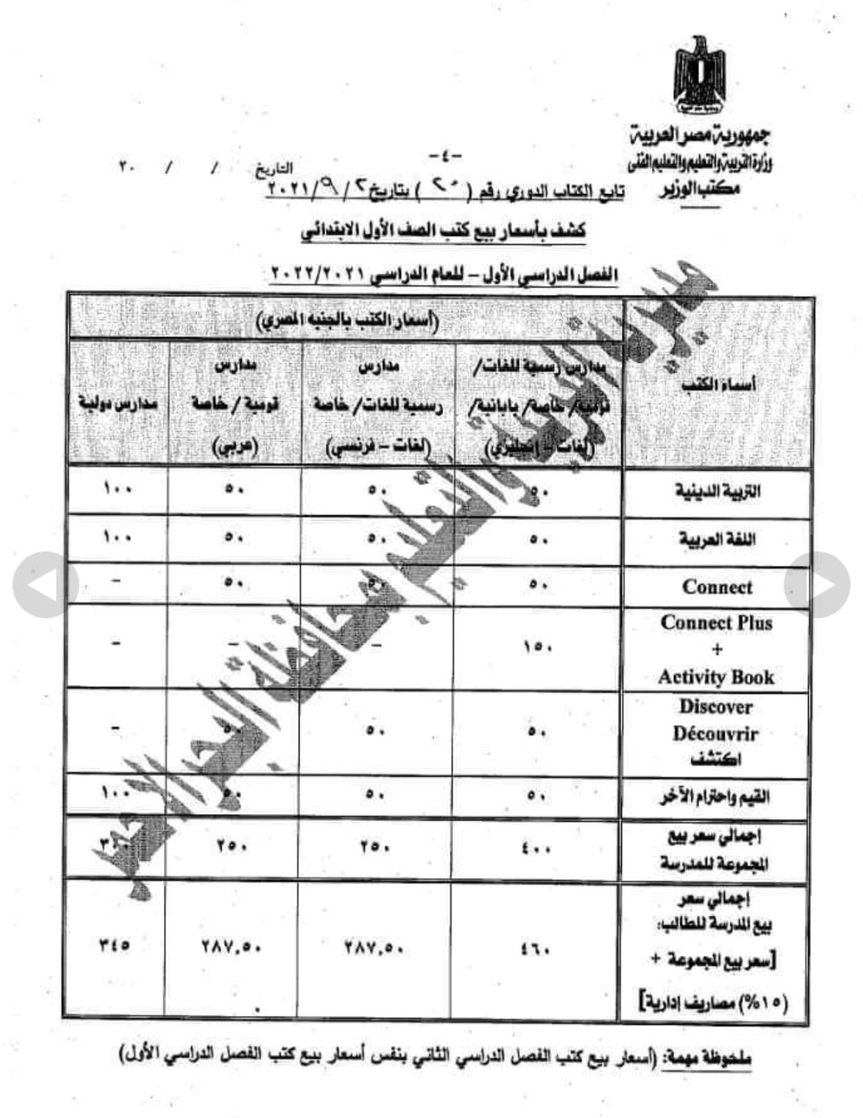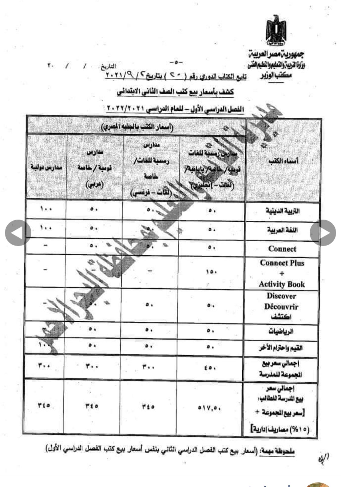 وجهت وزارة التربية والتعليم كتابًا دوريًا للمديريات التعليمية على مستوى الجمهورية قبل بدء العام الدراسي الجديد، بشأن أسعار الكتب المطورة للمدارس الرسمية للغات، والخاصة واليابانية والدولية.