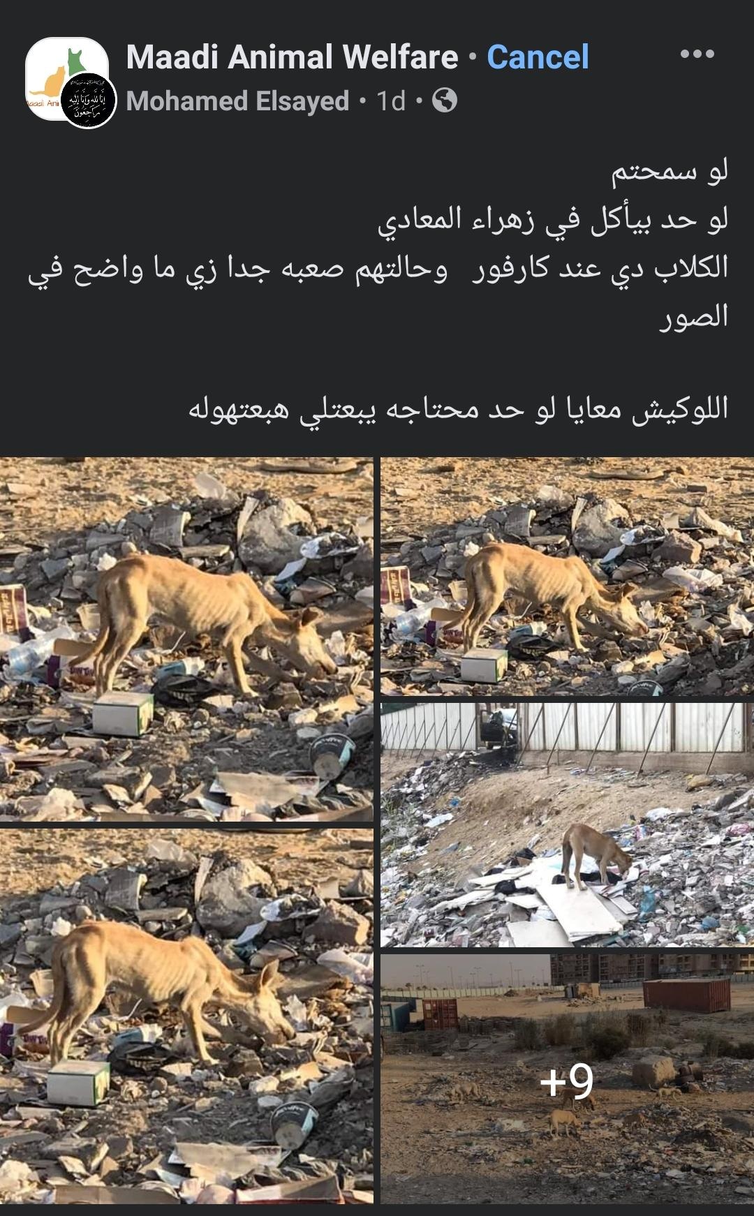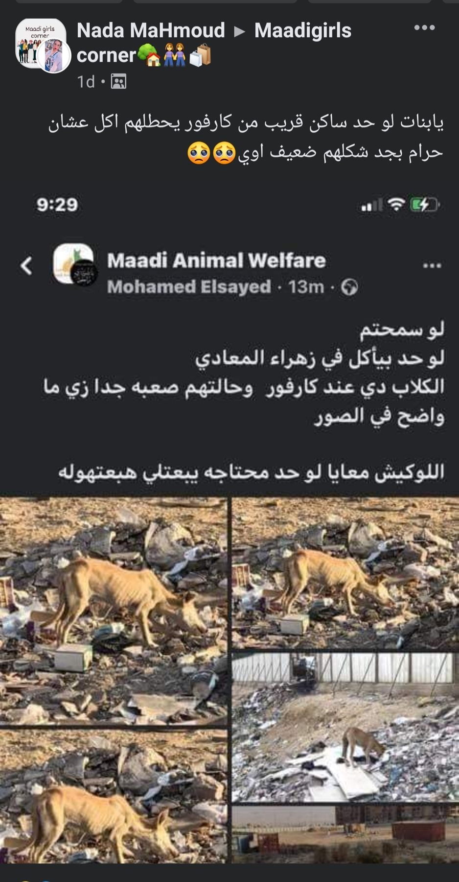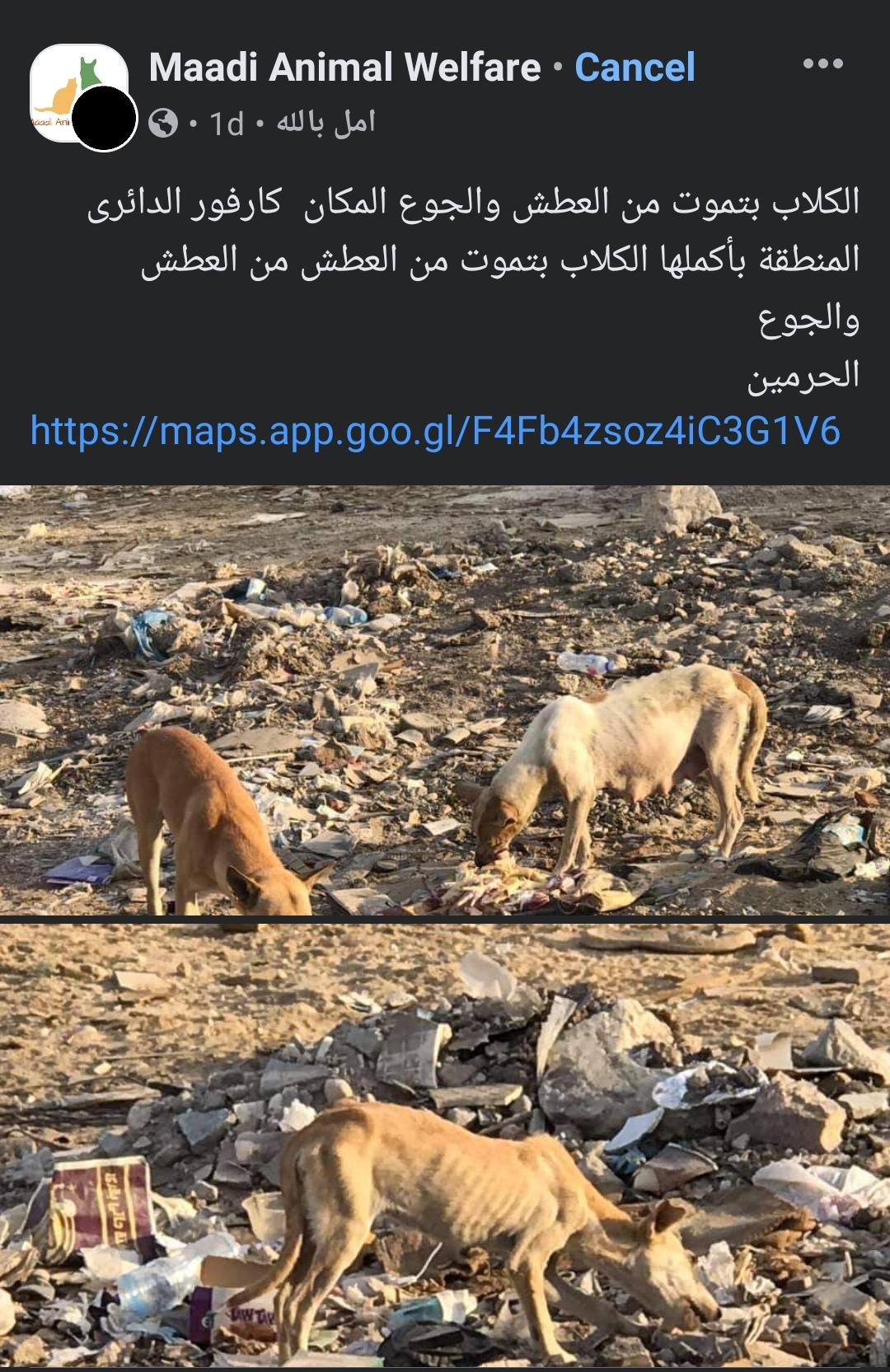 استغاث مجموعة من أهالي منطقة زهراء المعادي بمحافظة القاهرة، بالمسؤولين وجمعيات الرفق بالحيوان، لإنقاذ الكلاب الموجودة بالمنطقة من المجاعة.